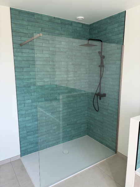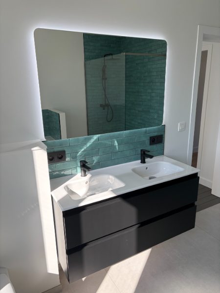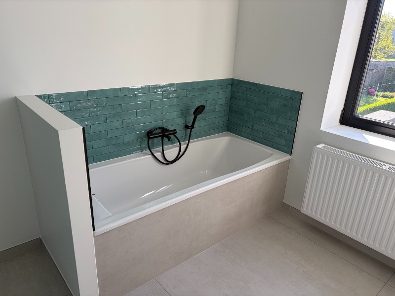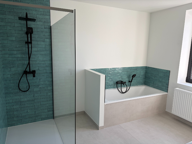 10,5 m² | nieuw en modern ingerichte badkamer op tegelvloer voorzien van: ligbad, dubbele lavabo, hangtoilet en inloopdouche