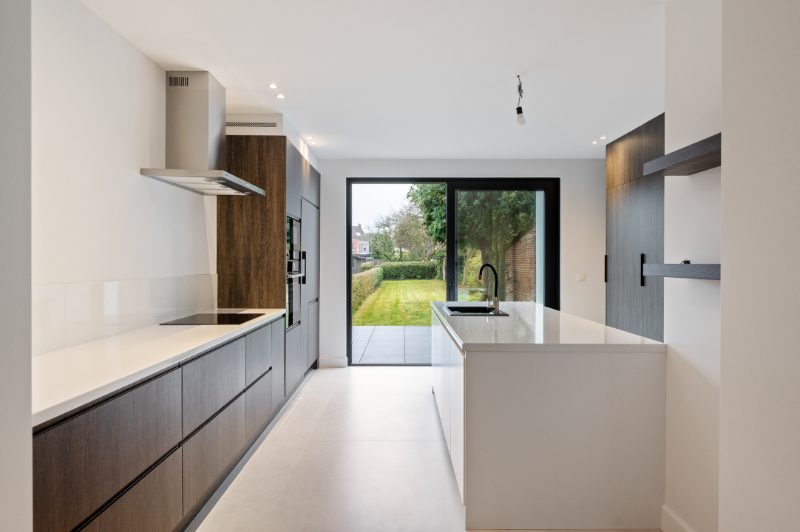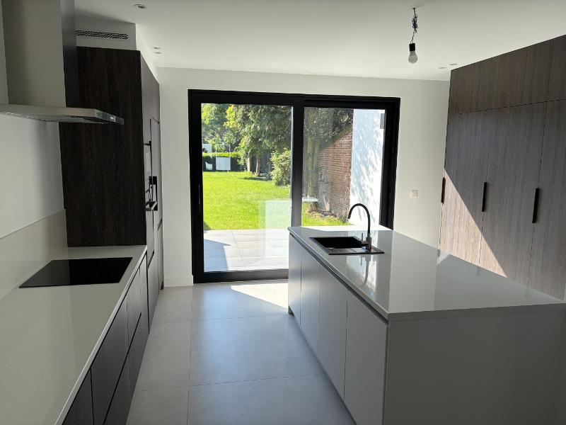18,4 m² | luxueus nieuw ingerichte leefkeuken op tegelvloer voorzien van: inductie kookplaat, dampkap, warmeluchtoven, microgolfoven, koelkast, diepvriezer, enkele spoeltafel en vaatwasser, alsook ingemaakte kast voor aansluiting wasmachine en droogkast