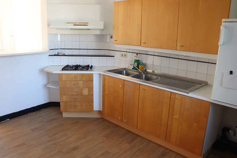 | 12 m² | plankenvloer : Gasfornuis, dampkap, dubbele spoeltafel, koelkast en aansluiting voor wasmachine | |