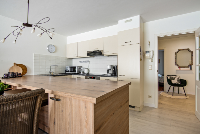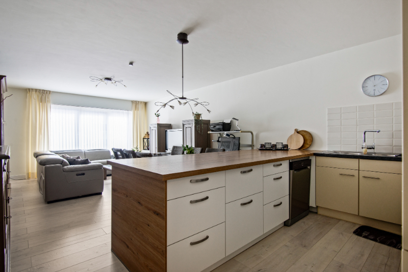 | ingerichte keuken op laminaat voorzien van: oven, vaatwasser, dampkap, koelkast en spoeltafel | |