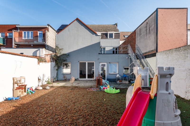 De handelsruimte van 140m2 is verdeeld in 4 compartimenten. Het beschikt verder over 2 x een apart toilet en een ingerichte keuken. Op de 1eV bevinden zich 2 slaapkamers. Een aparte inkom leidt naar het woonstgedeelte op het 1eV en 2eV. Dit woongedeelte is ingedeeld in: 1eV: traphall, een woonkamer, een slaapkamer, een ingerichte keuken en een apart toilet; 2eV: 5 slaapkamers en een zolderruimte. Verder beschikt dit pand over een tuin op kunstgras en een terras.