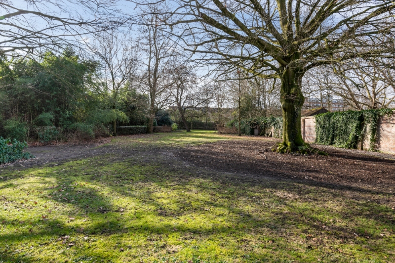 prachtig aangelegde & ommuurde tuin met gazonstrook, oude beuken & platanen met uitweg