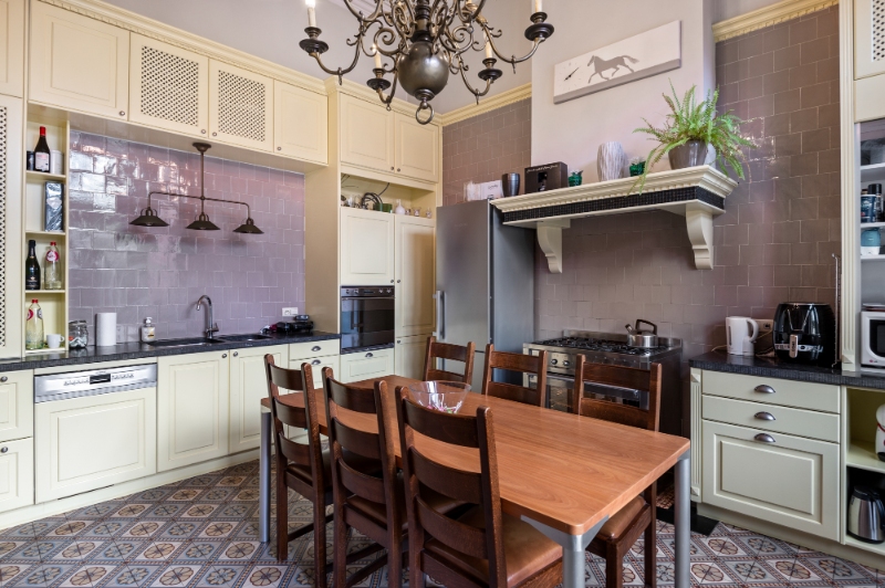 20,8 m² | luxueus ingerichte keuken op authenthieke vloer voorzien van: vaatwasser, dubbele spoeltafel, werkblad in blauwe hardsteen, 6 pit gasfornuis, SMEG oven, dampkap en ingebouwde koelkast